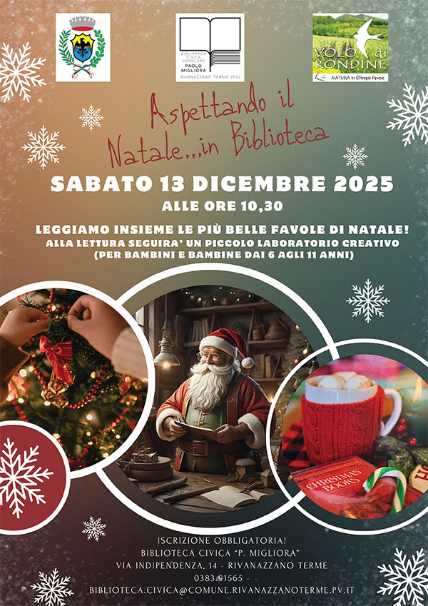 Laboratorio di lettura e creatività per bambini e bambine dai 6 agli 11 anni in collaborazione con A.p.s. Volo di Rondine “ASPETTANDO IL NATALE… IN BIBLIOTECA” di Alberto Lot SABATO 13 DICEMBRE 2025 – Ore 15,30 presso la Sala Manifestazioni della Biblioteca Leggiamo insieme le più belle favole di Natale! Alla lettura seguirà un piccolo […]