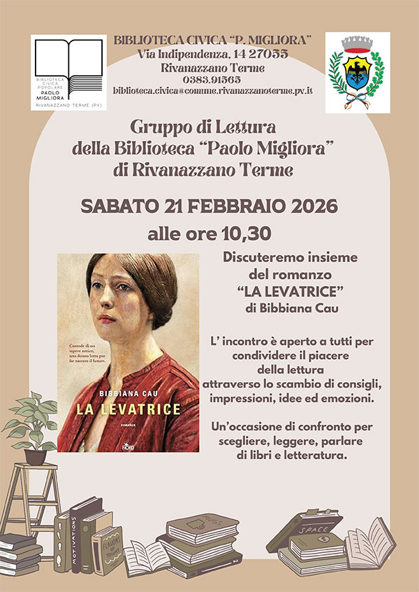 Sabato 21 febbraio 2026 alle ore 10,30 presso la Biblioteca Civica “Paolo Migliora” di Rivanazzano Terme in Via Indipendenza n. 14, si riunirà il Gruppo di Lettura per discutere e riflettere insieme sul romanzo di esordio di Bibbiana Cau “La levatrice” (Edizioni Nord). Come di consueto l’invito è esteso anche a coloro che non hanno letto il testo proposto ma che fossero interessati ad accogliere o condividere consigli e spunti di lettura.