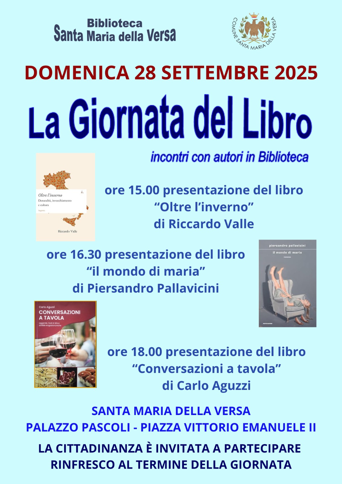Domenica 28 settembre 2025, la Biblioteca di Santa Maria della Versa celebra la passione per la lettura con La Giornata del Libro, un pomeriggio dedicato agli incontri con gli autori e alla scoperta di nuove storie.