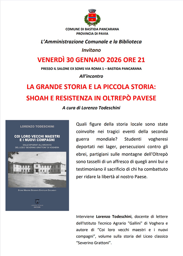 A partire dal volume di Lorenzo Todeschini “Coi loro vecchi maestri e i nuovi compagni”, dedicato alla storia del Liceo classico “Severino Grattoni” di Voghera, l’incontro ripercorre vicende locali legate alla seconda guerra mondiale: studenti deportati nei lager, persecuzioni contro gli ebrei, partigiani sulle montagne dell’Oltrepò. Tasselli di memoria che restituiscono il quadro di un’epoca buia e il sacrificio di chi ha combattuto per la libertà del Paese.