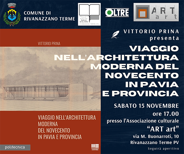 Sabato 15 novembre 2025 alle ore 17.00, presso la sede dell’Associazione Culturale ARTart di Rivanazzano Terme (Via M. Buonarroti, 10), sarà presentato il volume di Vittorio Prina, “Viaggio nell’architettura moderna del Novecento in Pavia e Provincia” (Maggioli Editore).